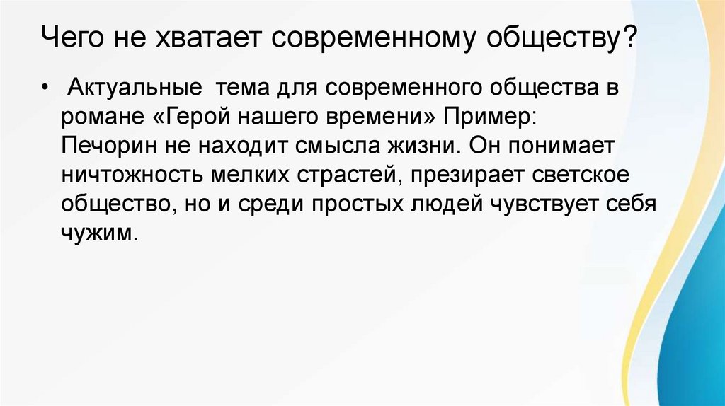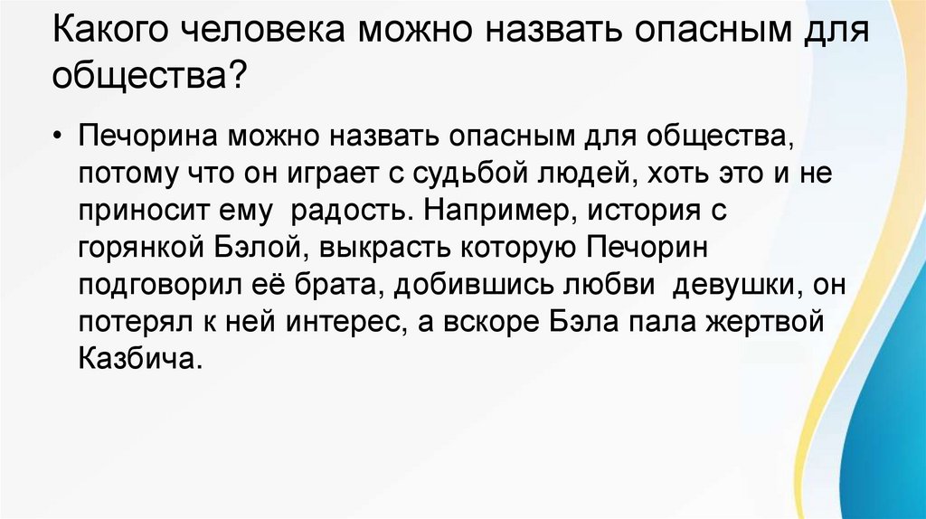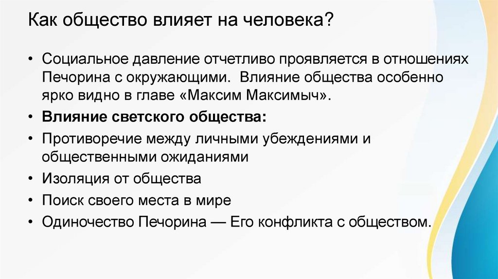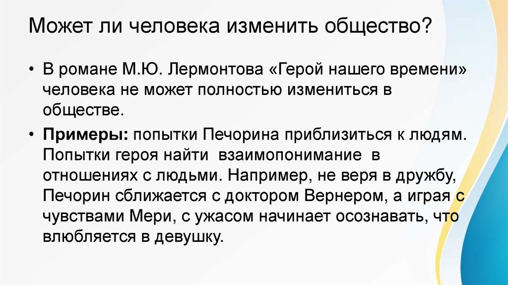 Может ли человека изменить общество?• В романе М.Ю. Лермонтова «Герой нашего времени»