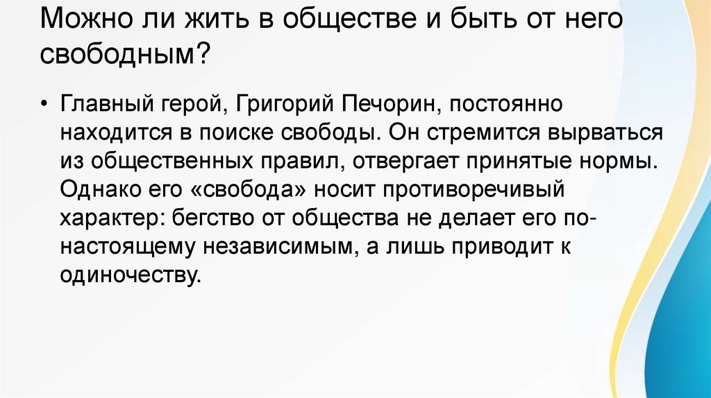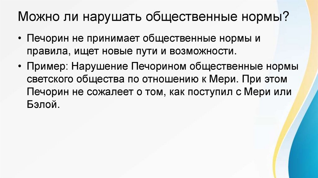 Можно ли нарушать общественные нормы?• Печорин не принимает общественные нормы и