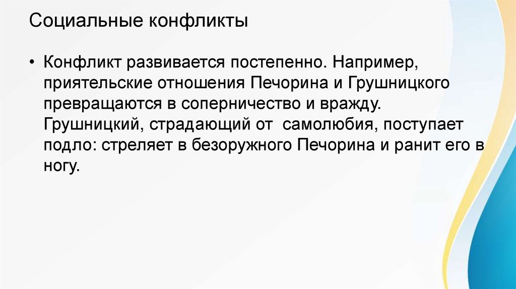 Социальные конфликты• Конфликт развивается постепенно. Например,