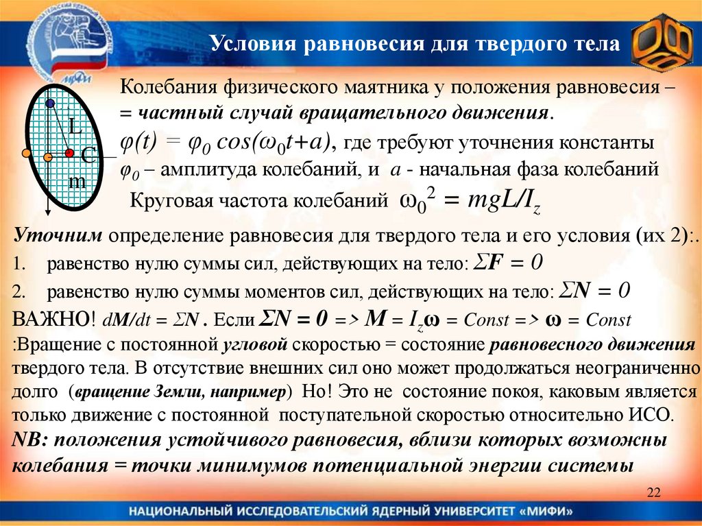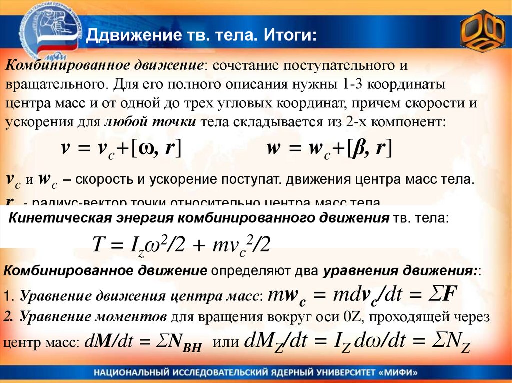 центр масс: dM/dt = ΣNBH или dMZ/dt = IZ dω/dt = ΣNZ