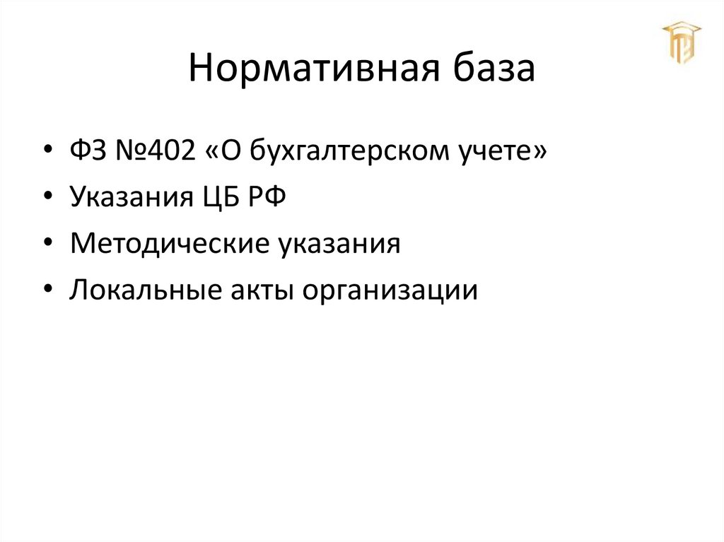 Нормативная база• ФЗ №402 «О бухгалтерском учете»