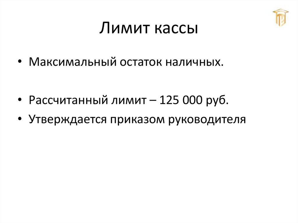 Лимит кассы• Максимальный остаток наличных.