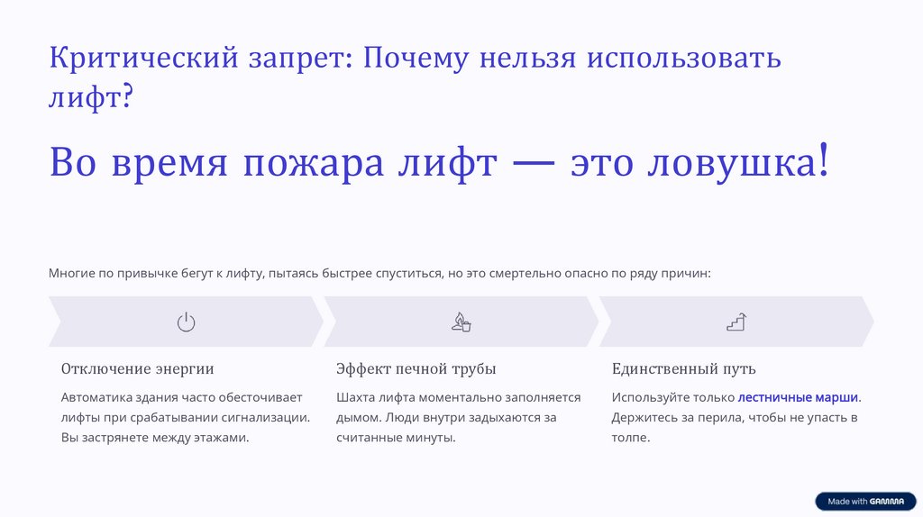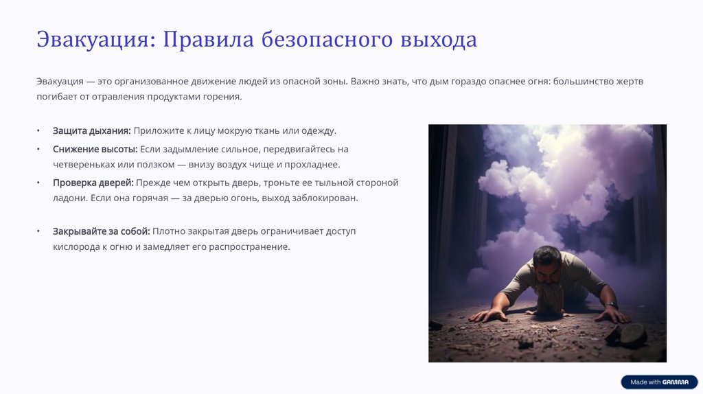 Эвакуация: Правила безопасного выходаЭвакуация — это организованное движение людей из опасной зоны. Важно знать, что дым гораздо опаснее огня: большинство жертв