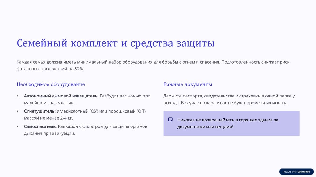 Семейный комплект и средства защитыКаждая семья должна иметь минимальный набор оборудования для борьбы с огнем и спасения. Подготовленность снижает риск