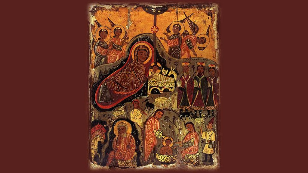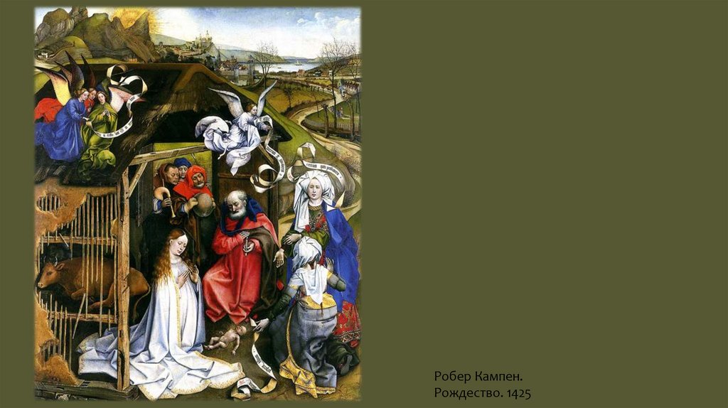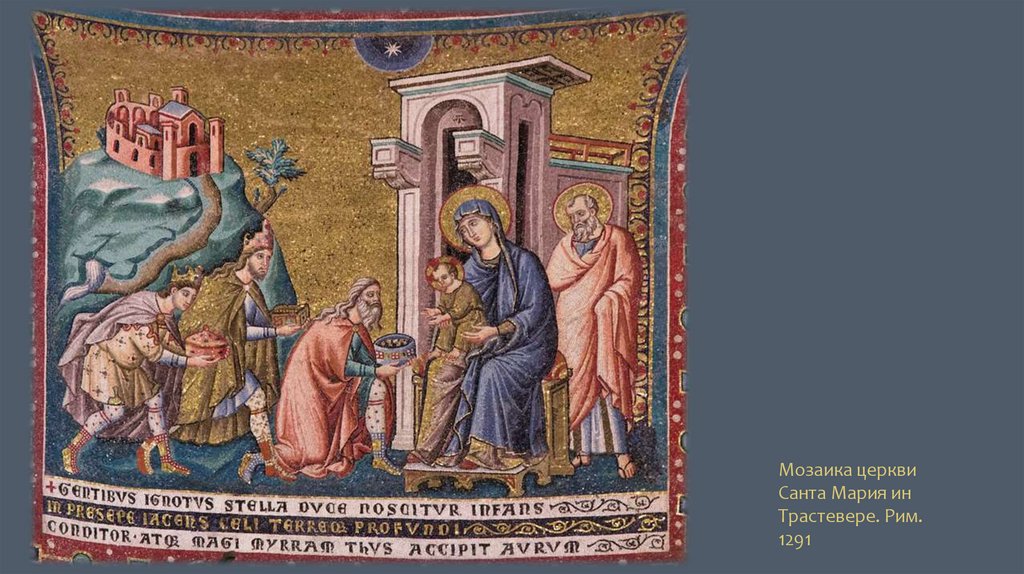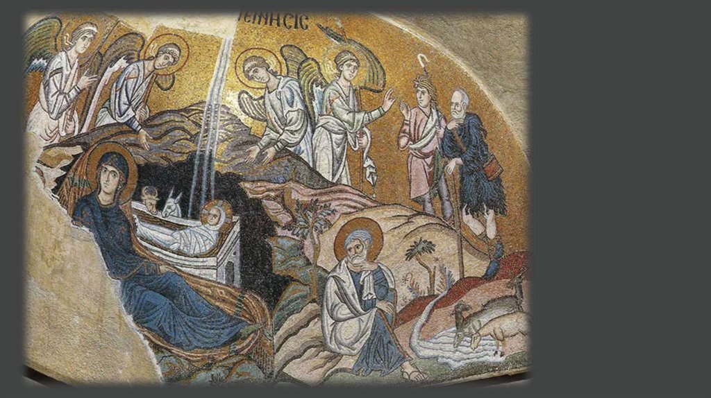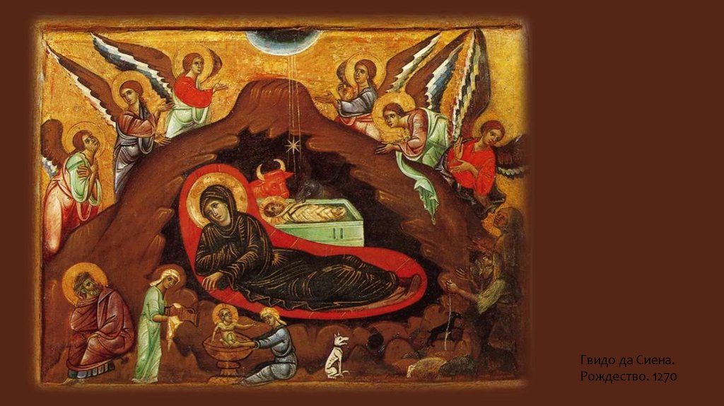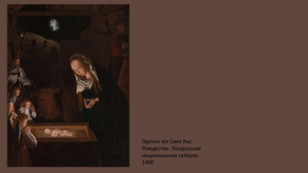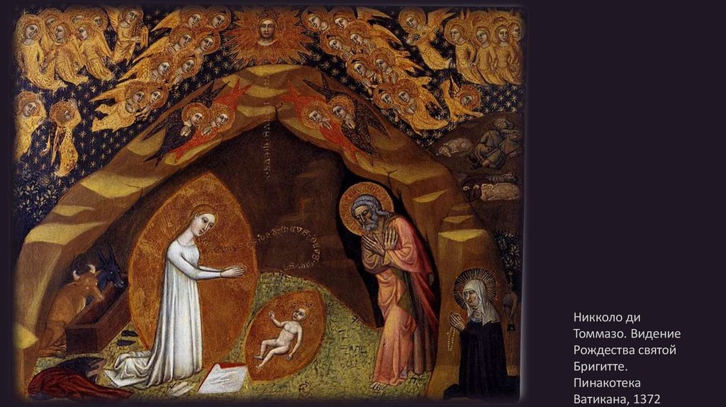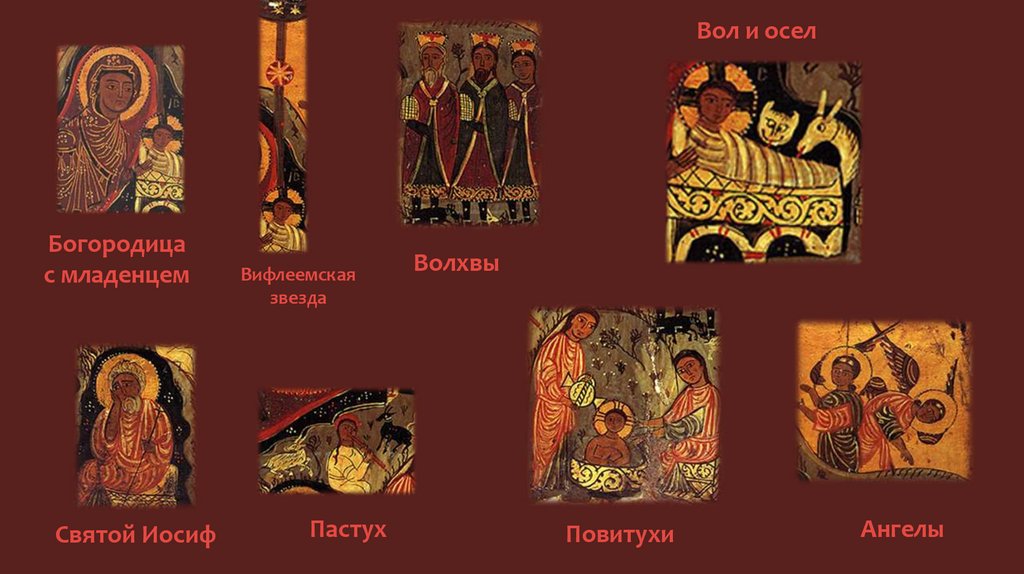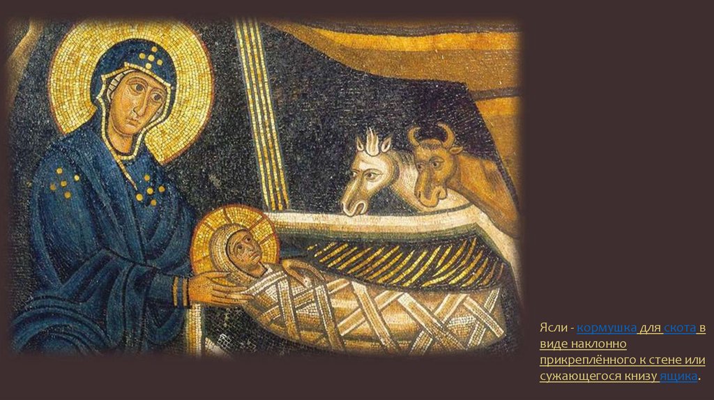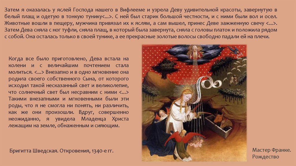 Затем я оказалась у яслей Господа нашего в Вифлееме и узрела Деву удивительной красоты, завернутую вбелый плащ и одетую в тонкую тунику<...>. С ней был старик большой честности, и с ними были вол и осел.