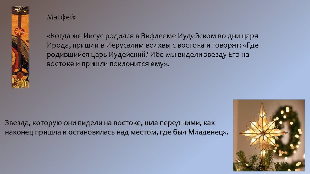 Матфей:«Когда же Иисус родился в Вифлееме Иудейском во дни царя