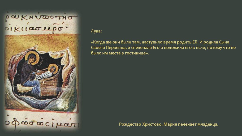 Лука:«Когда же они были там, наступило время родить Ей. И родила Сына