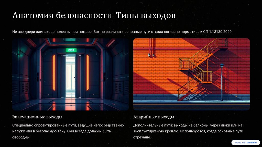 Анатомия безопасности: Типы выходовНе все двери одинаково полезны при пожаре. Важно различать основные пути отхода согласно нормативам СП 1.13130.2020.