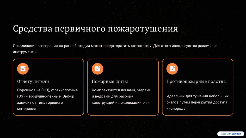 Средства первичного пожаротушенияЛокализация возгорания на ранней стадии может предотвратить катастрофу. Для этого используются различные