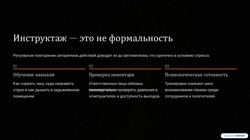 Инструктаж — это не формальностьРегулярное повторение алгоритмов действий доводит их до автоматизма, что критично в условиях стресса.