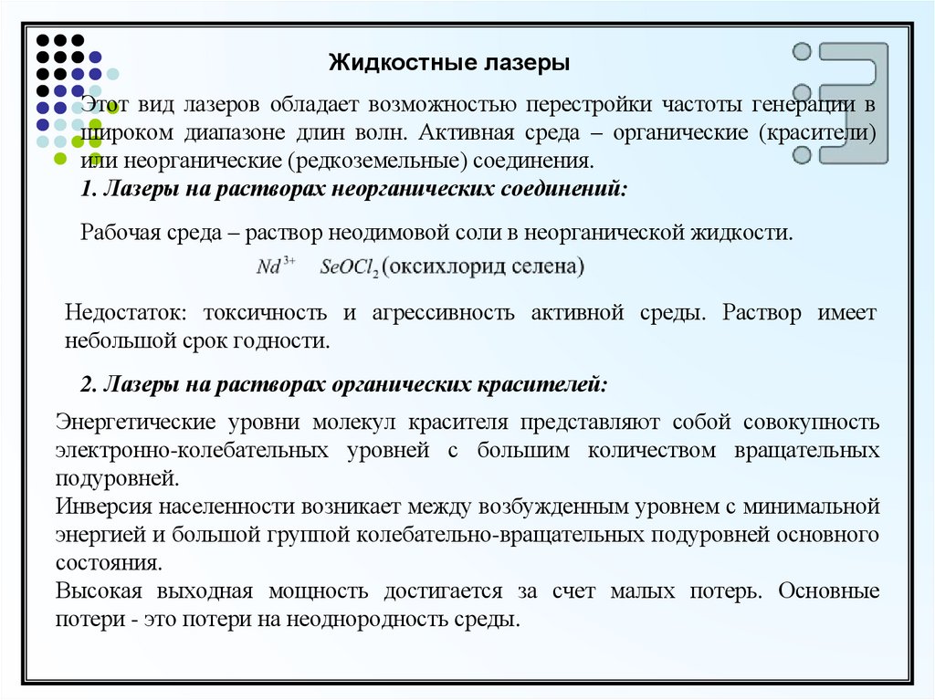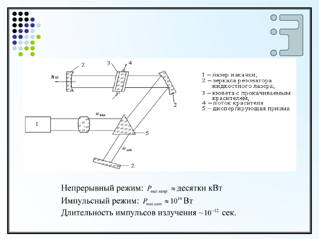 Жидкостные лазерыЭтот вид лазеров обладает возможностью перестройки частоты генерации в
