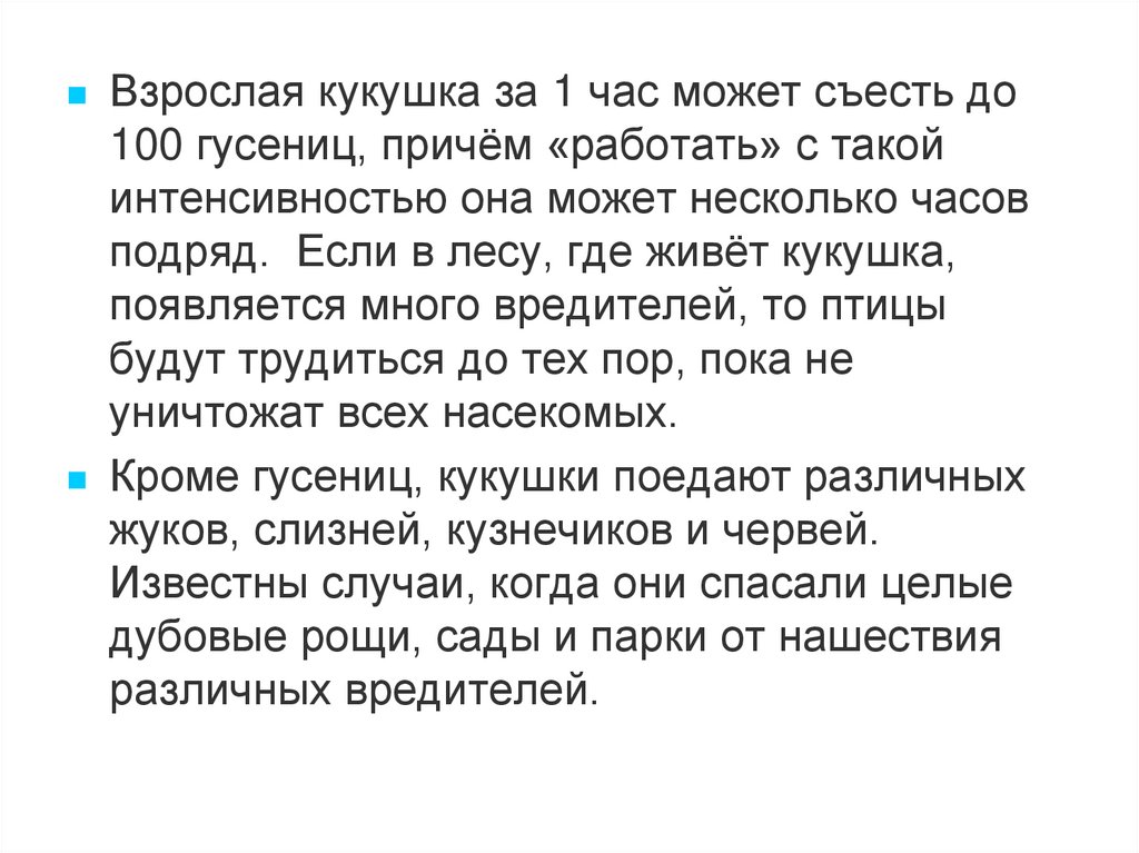 Взрослая кукушка за 1 час может съесть до100 гусениц, причём «работать» с такой