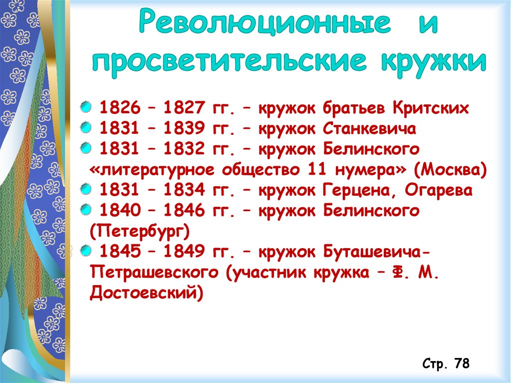 1826 – 1827 гг. – кружок братьев Критских1831 – 1839 гг. – кружок Станкевича