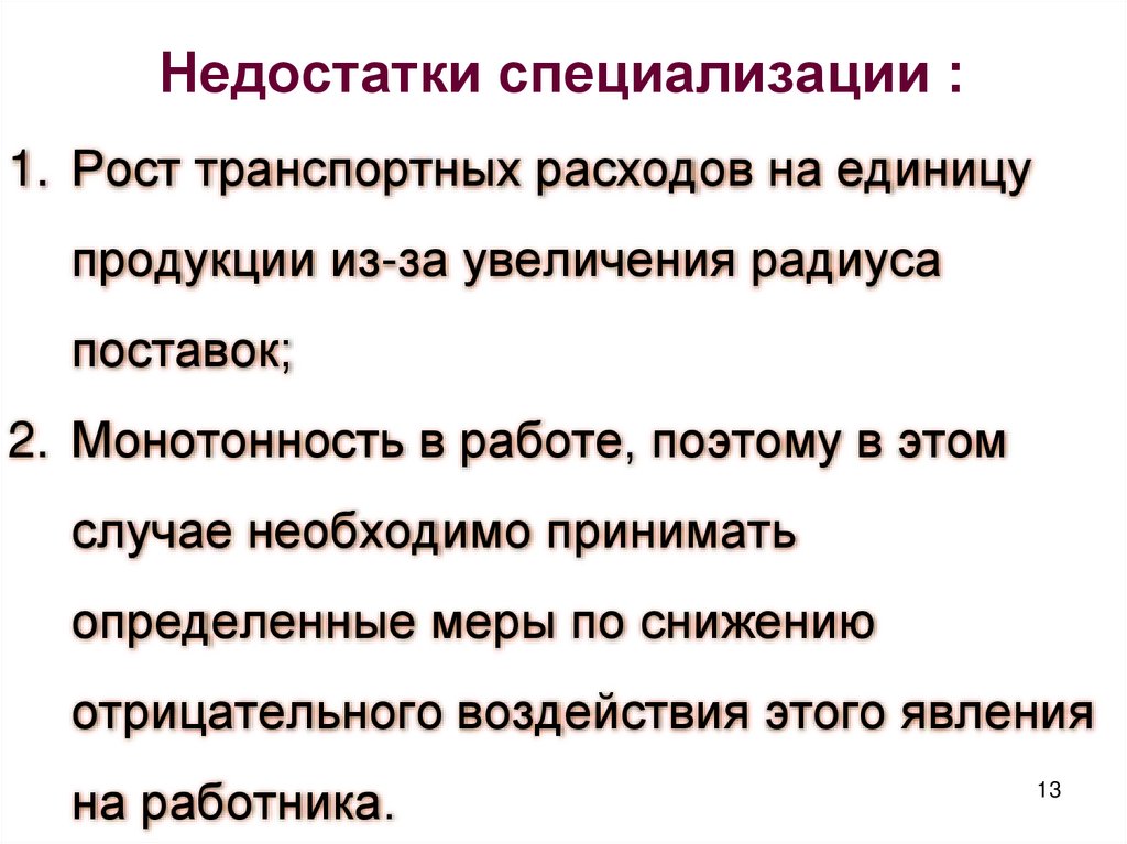 Недостатки специализации :1. Рост транспортных расходов на единицу