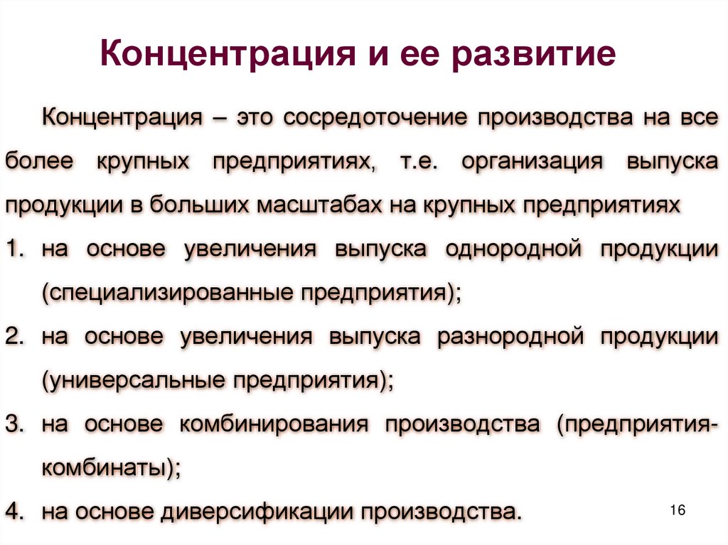 Концентрация и ее развитиеКонцентрация – это сосредоточение производства на все