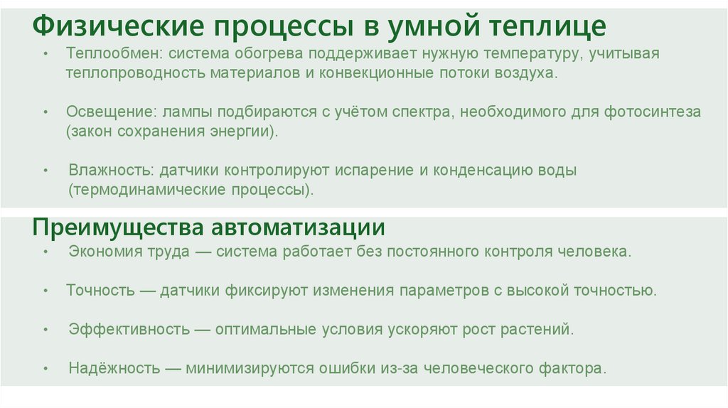 Физические процессы в умной теплицеТеплообмен: система обогрева поддерживает нужную температуру, учитывая