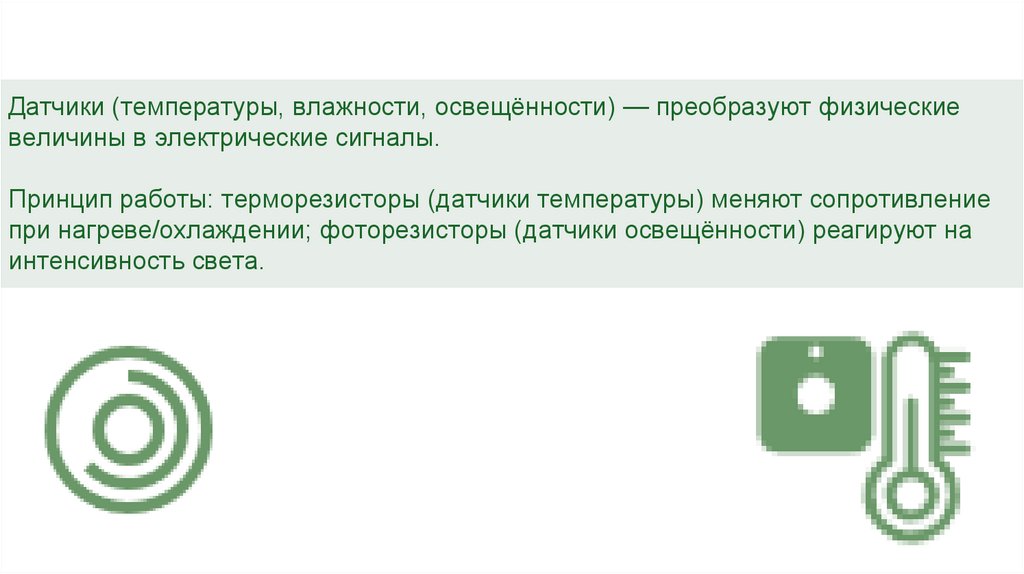 Датчики (температуры, влажности, освещённости) — преобразуют физическиевеличины в электрические сигналы.