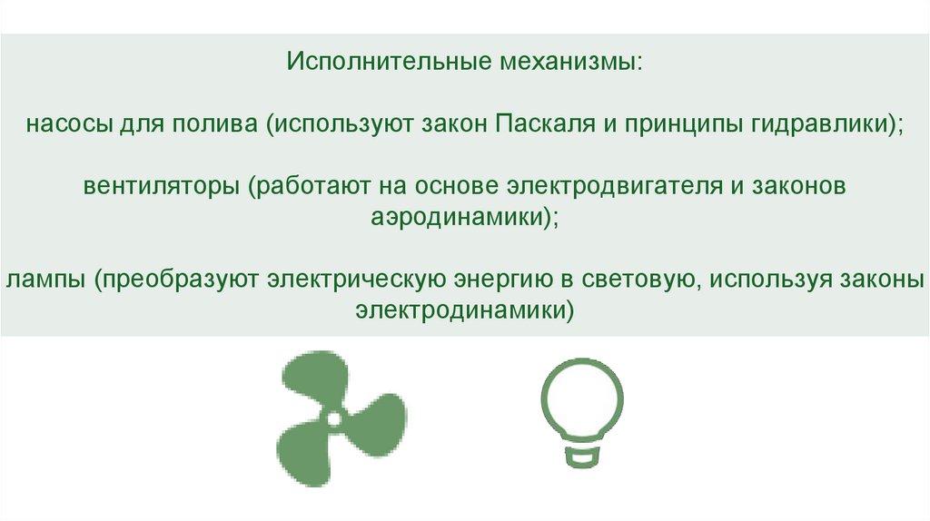 Исполнительные механизмы:насосы для полива (используют закон Паскаля и принципы гидравлики);