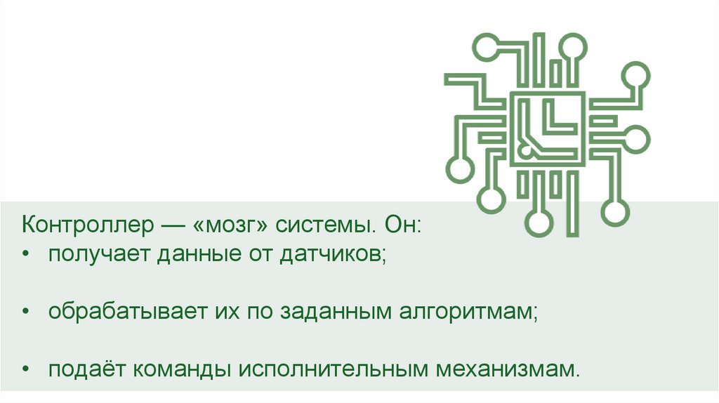 Контроллер — «мозг» системы. Он:• получает данные от датчиков;