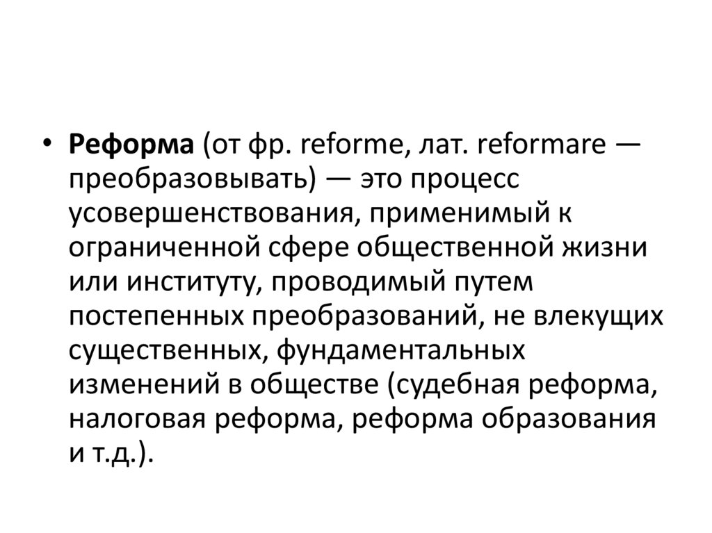• Реформа (от фр. reforme, лат. reformare —преобразовывать) ― это процесс