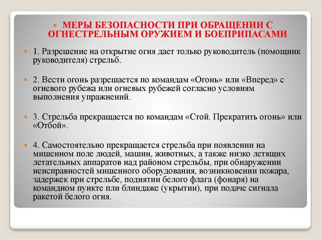 МЕРЫ БЕЗОПАСНОСТИ ПРИ ОБРАЩЕНИИ СОГНЕСТРЕЛЬНЫМ ОРУЖИЕМ И БОЕПРИПАСАМИ