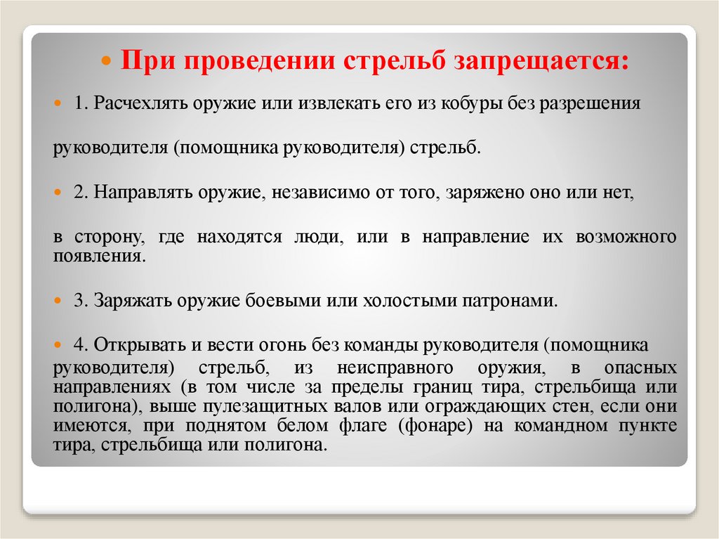 При проведении стрельб запрещается:1. Расчехлять оружие или извлекать его из кобуры без разрешения