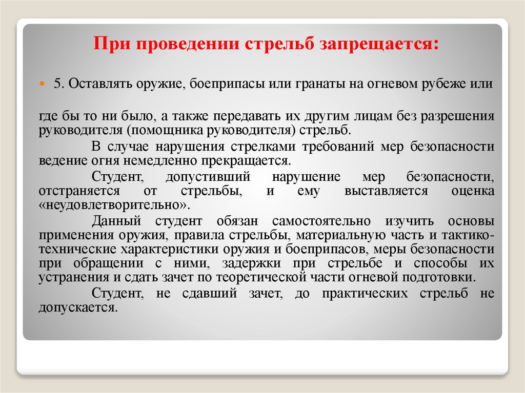 При проведении стрельб запрещается:5. Оставлять оружие, боеприпасы или гранаты на огневом рубеже или