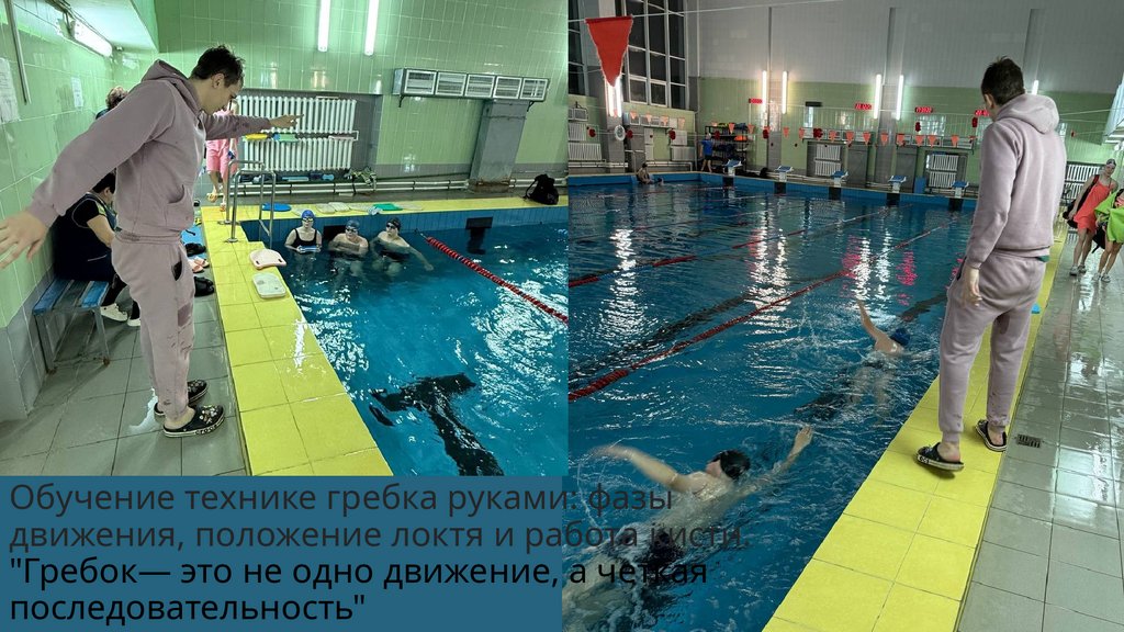 Обучение технике гребка руками: фазыдвижения, положение локтя и работа кисти.
