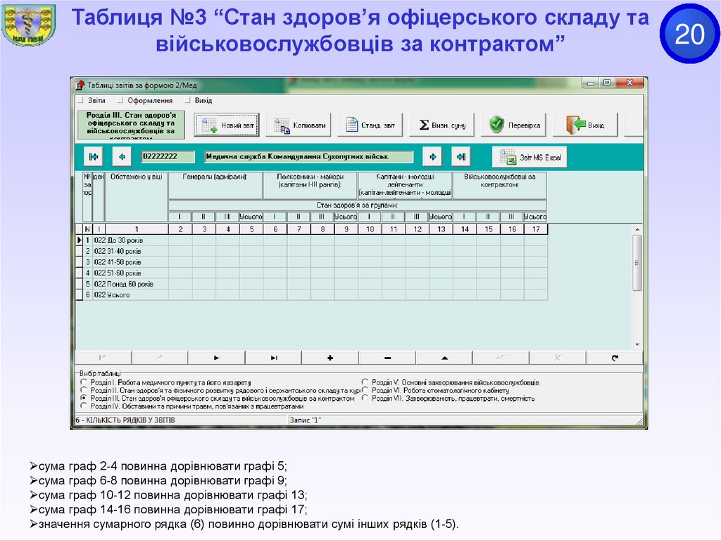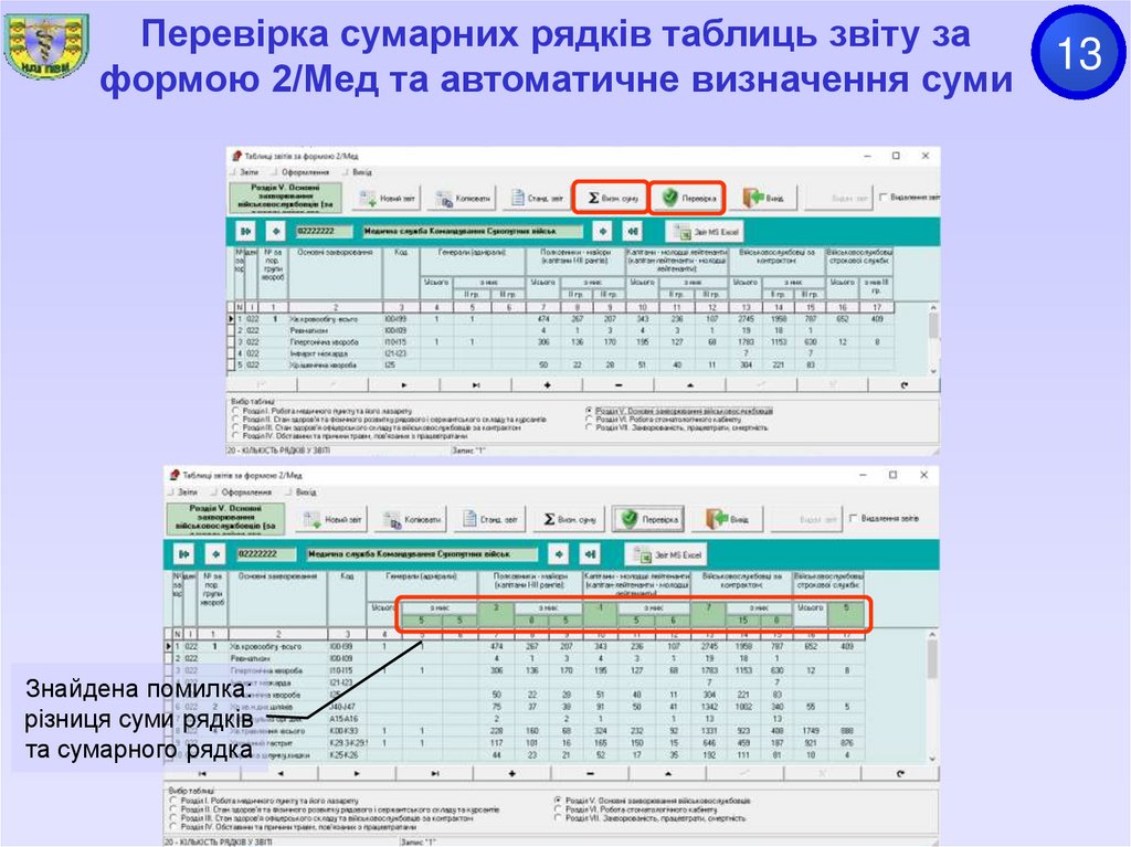 Перевірка сумарних рядків таблиць звіту заформою 2/Мед та автоматичне визначення суми