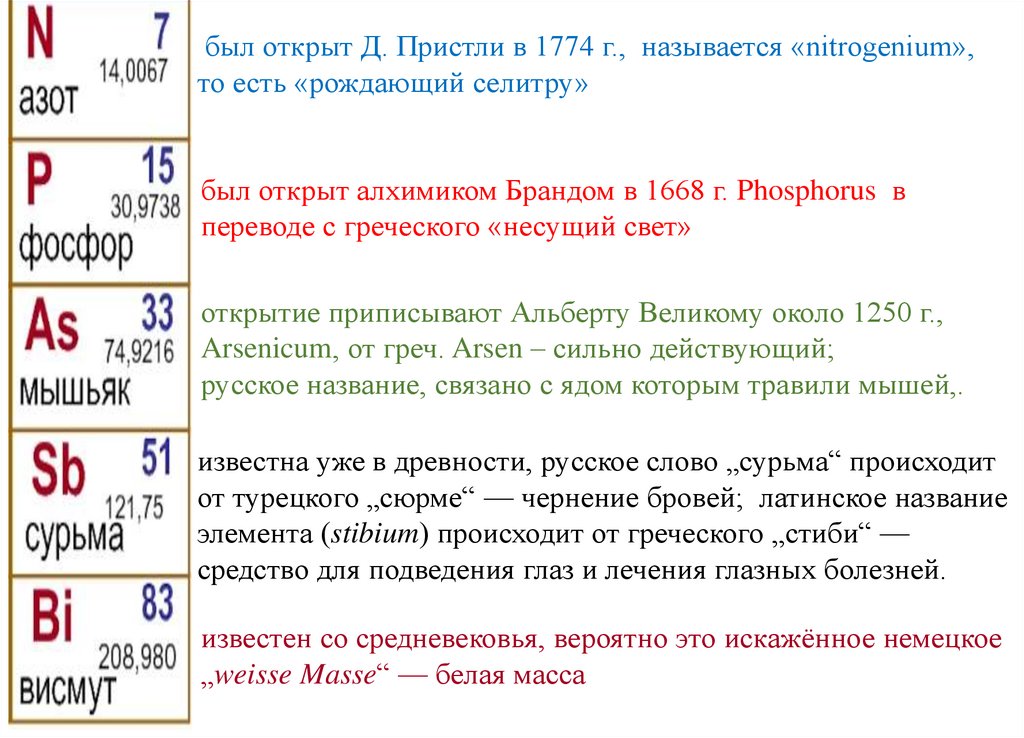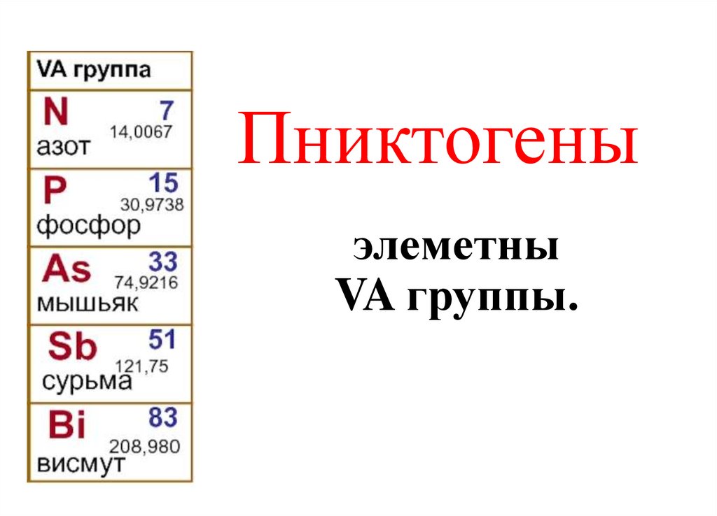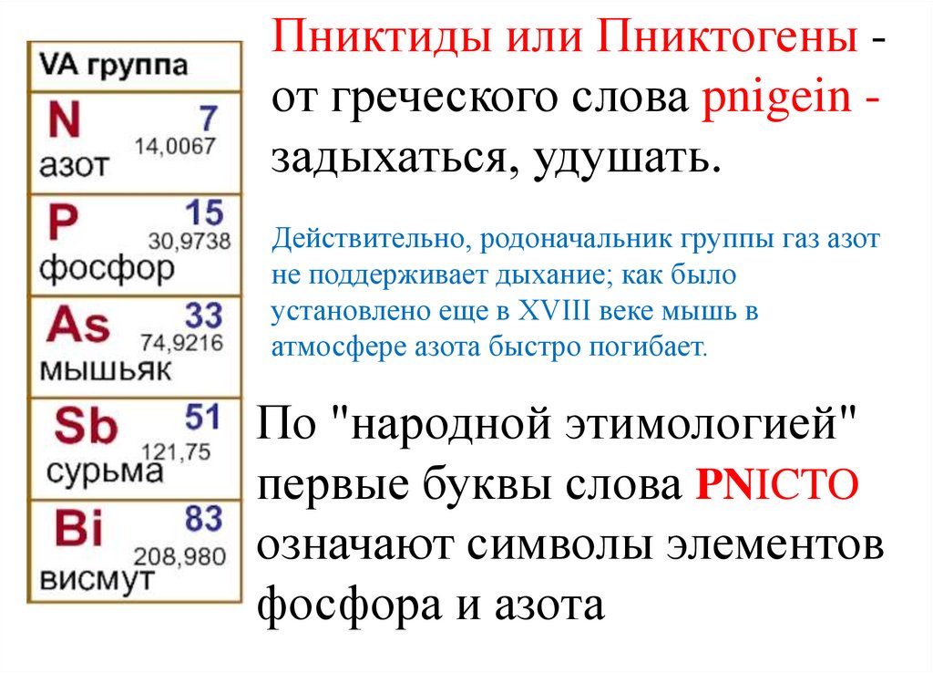 Пниктиды или Пниктогены от греческого слова pnigein задыхаться, удушать.Действительно, родоначальник группы газ азот