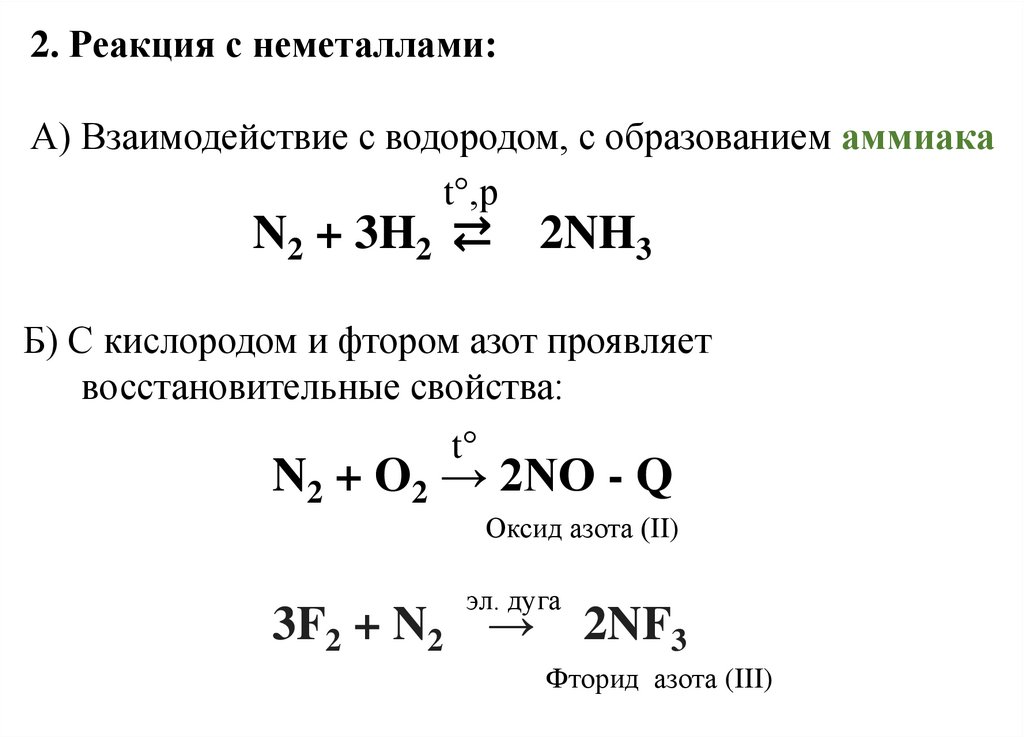 2. Реакция с неметаллами:А) Взаимодействие с водородом, с образованием аммиака