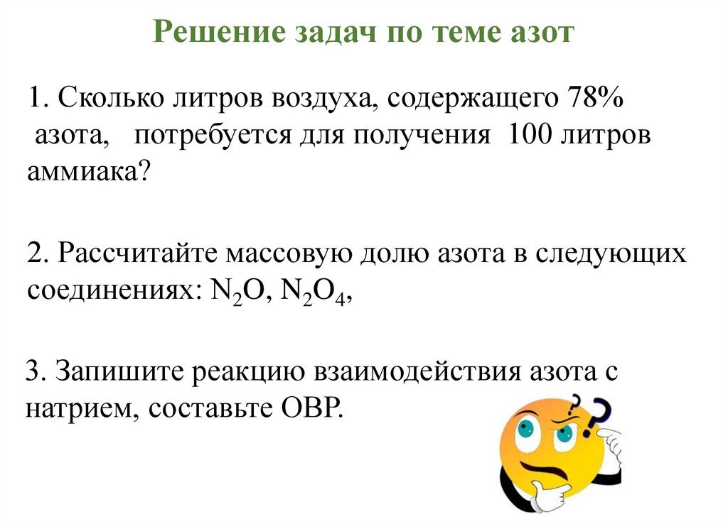 Решение задач по теме азот1. Сколько литров воздуха, содержащего 78%