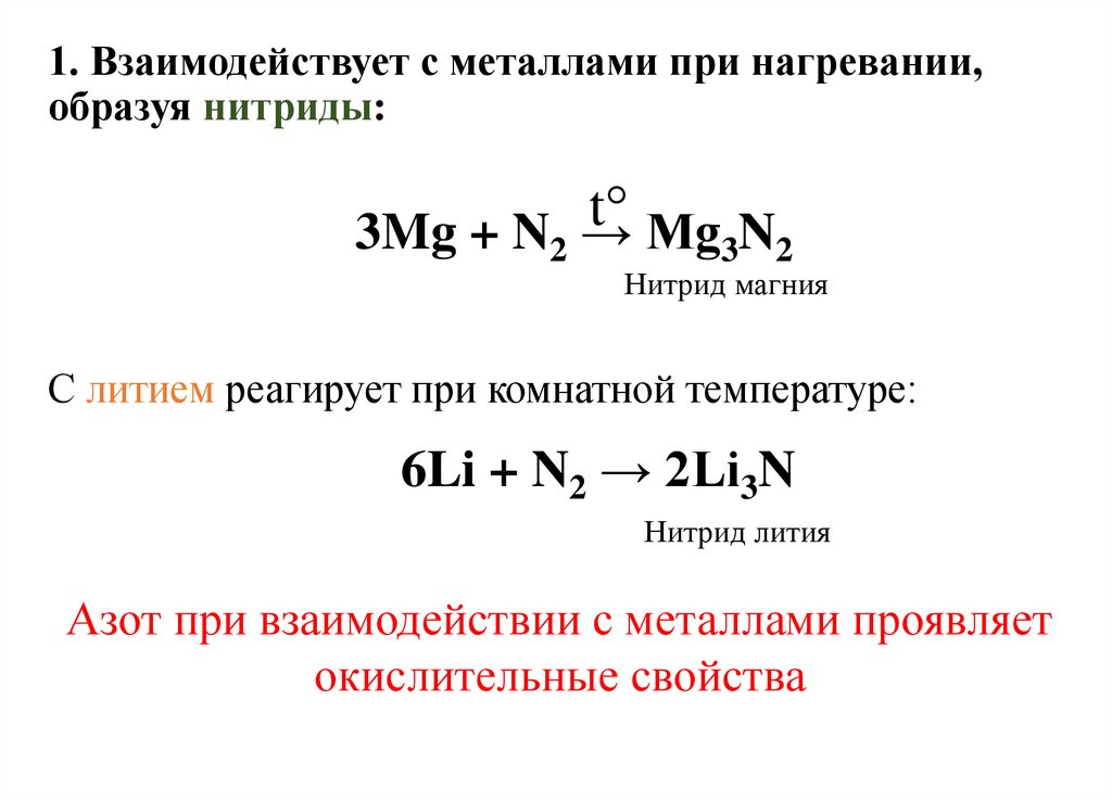 1. Взаимодействует с металлами при нагревании,образуя нитриды: