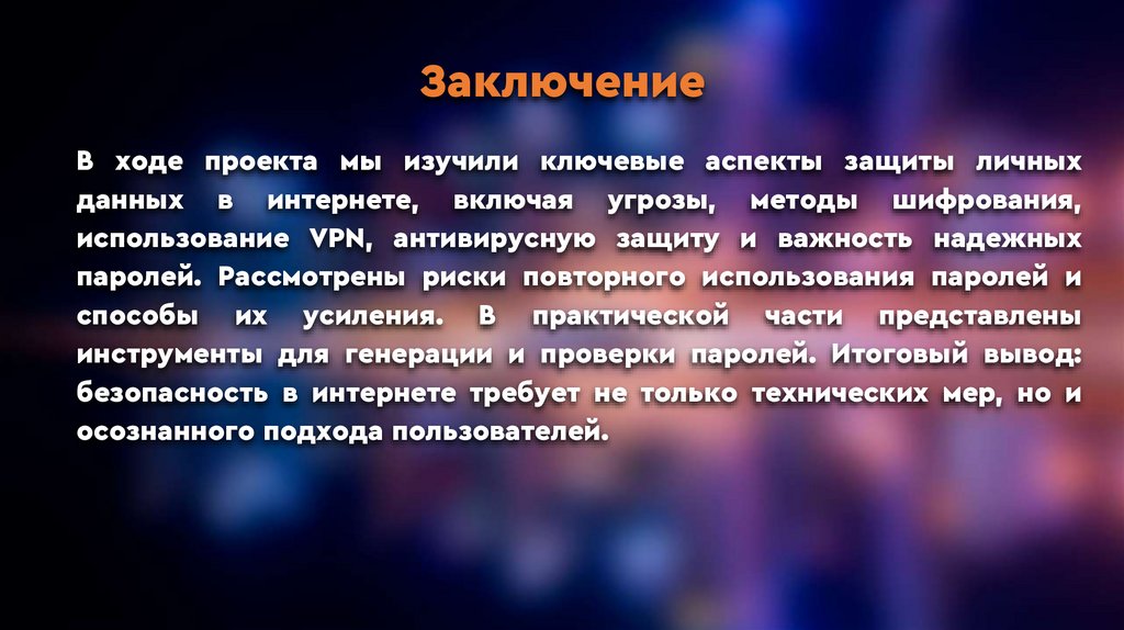 ЗаключениеВ ходе проекта мы изучили ключевые аспекты защиты личных