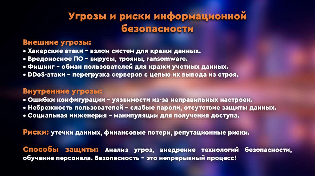 Риски: утечки данных, финансовые потери, репутационные риски.