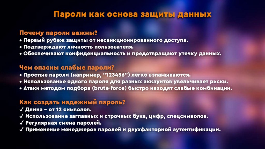 ✔ Применение менеджеров паролей и двухфакторной аутентификации.