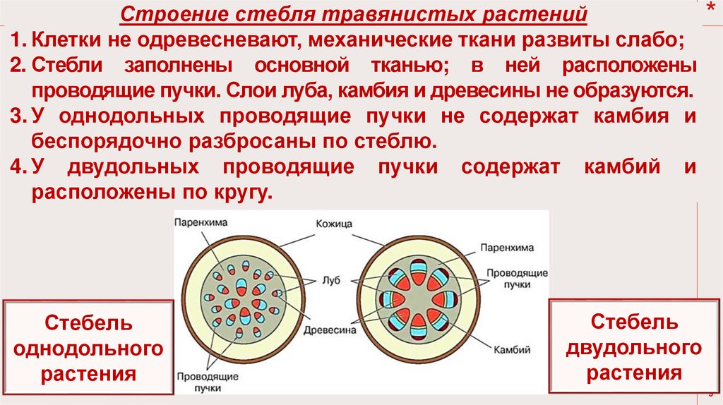 проводящие пучки. Слои луба, камбия и древесины не образуются.