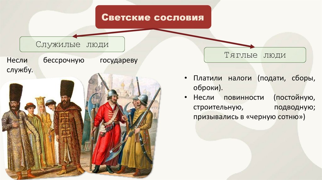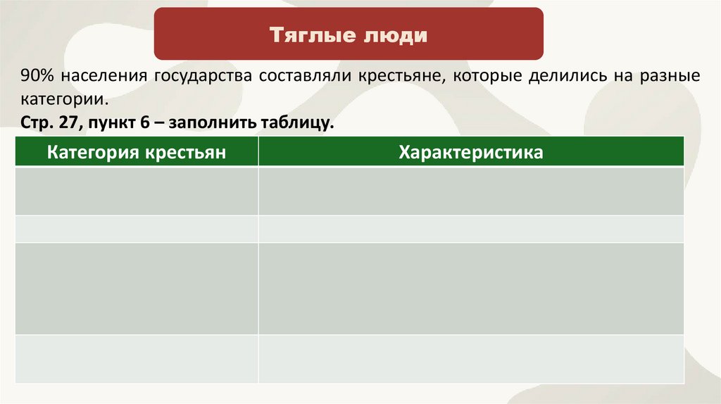 Тяглые люди90% населения государства составляли крестьяне, которые делились на разные