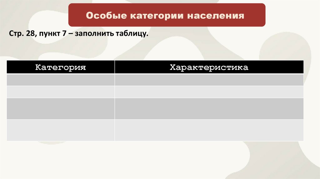 Особые категории населенияСтр. 28, пункт 7 – заполнить таблицу.