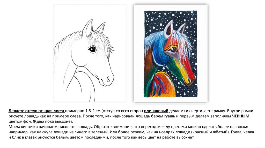 Делаете отступ от края листа примерно 1,5-2 см (отступ со всех сторон одинаковый делаем) и очертиваете рамку. Внутри рамкирисуете лошадь как на примере слева. После того, как нарисовали лошадь берем гуашь и первым делаем заполняем ЧЕРНЫМ