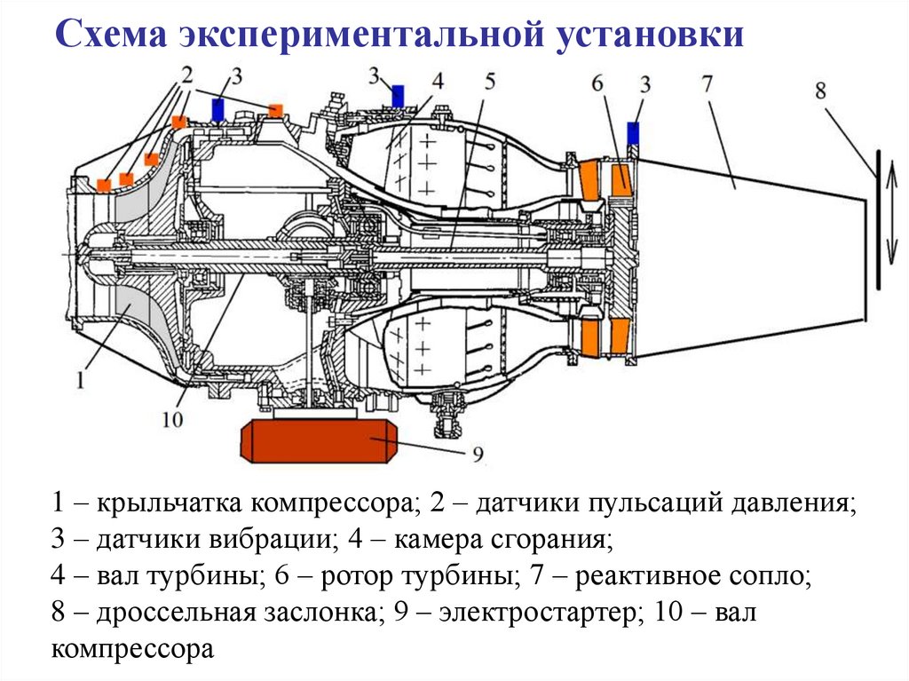 Схема экспериментальной установки1 – крыльчатка компрессора; 2 – датчики пульсаций давления;