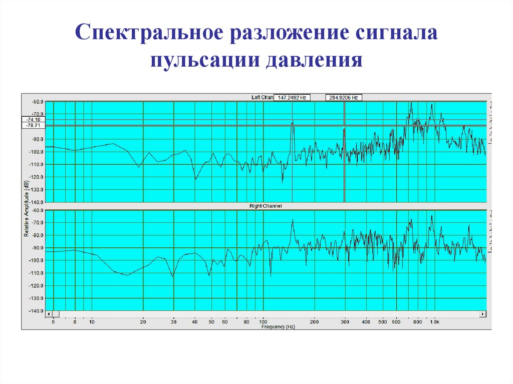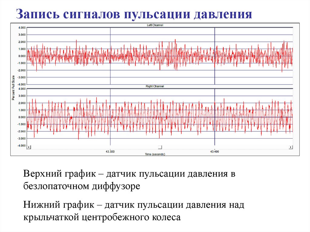 Запись сигналов пульсации давленияВерхний график – датчик пульсации давления в