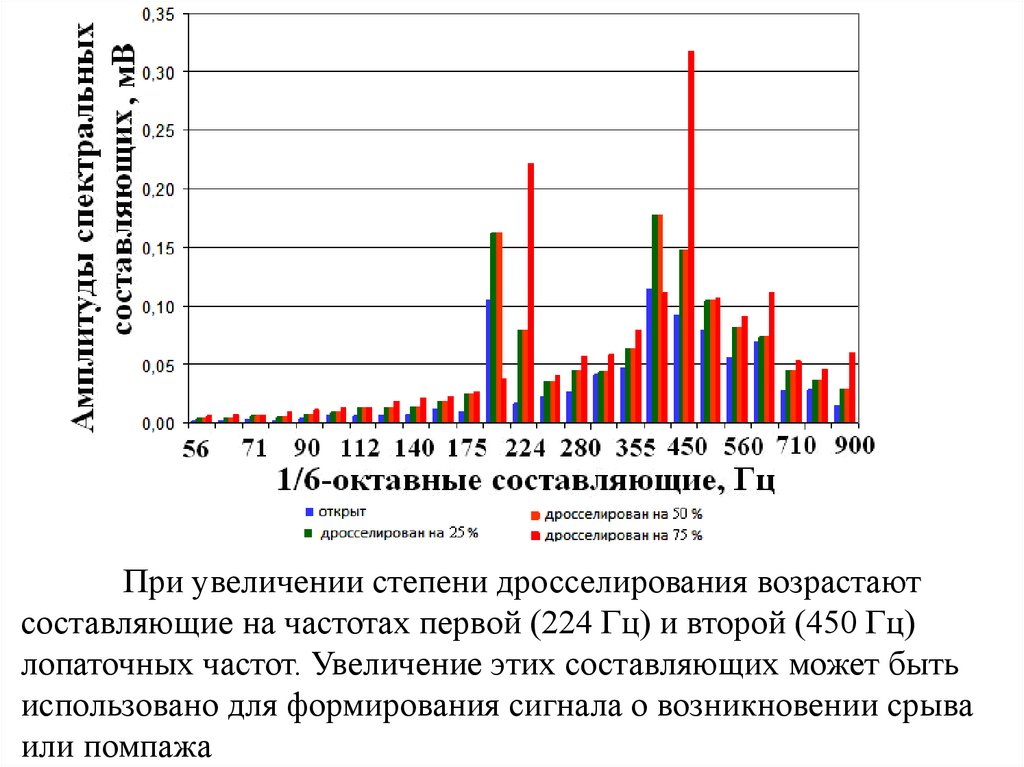 При увеличении степени дросселирования возрастаютсоставляющие на частотах первой (224 Гц) и второй (450 Гц)