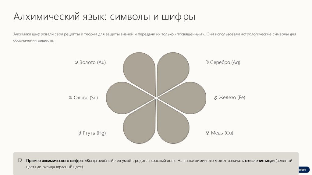Алхимический язык: символы и шиф рыАлхимики шиф ровали свои рецепты и теории для защиты знаний и передачи их только «посвящённым». Они использовали астрологические символы для