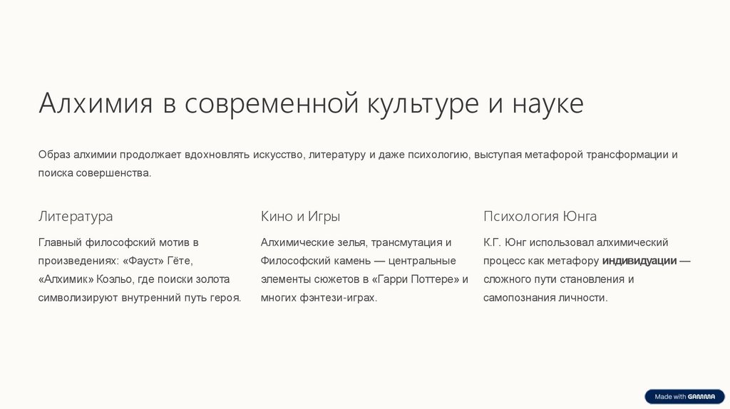 Алхимия в современной культуре и наукеОбраз алхимии продолжает вдохновлять искусство, литературу и даже психологию, выступая метафорой трансформации и