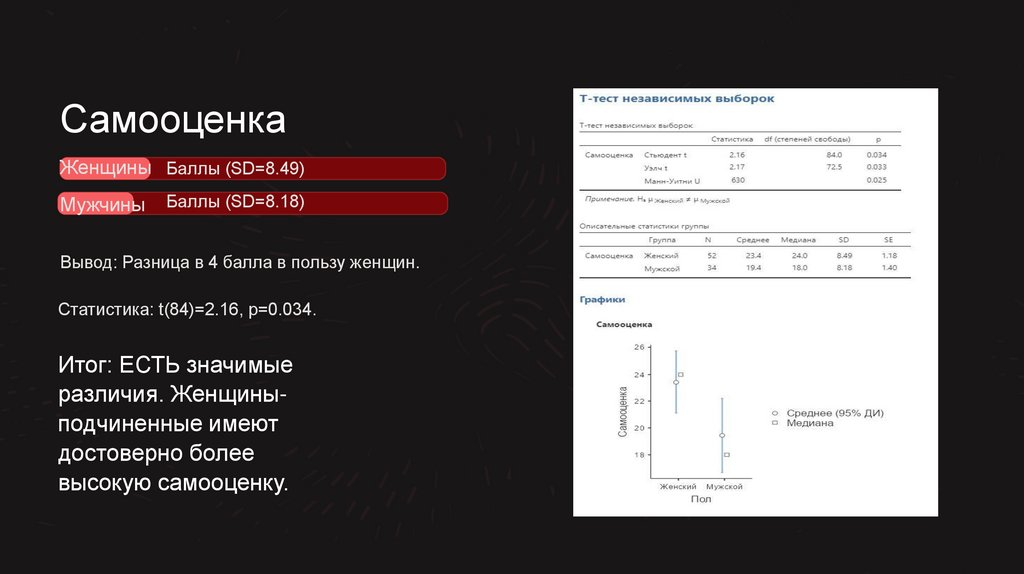 Ж: 8.13; М: 6.47. Самая большая разница. t(84)=3.01, p=0.003.