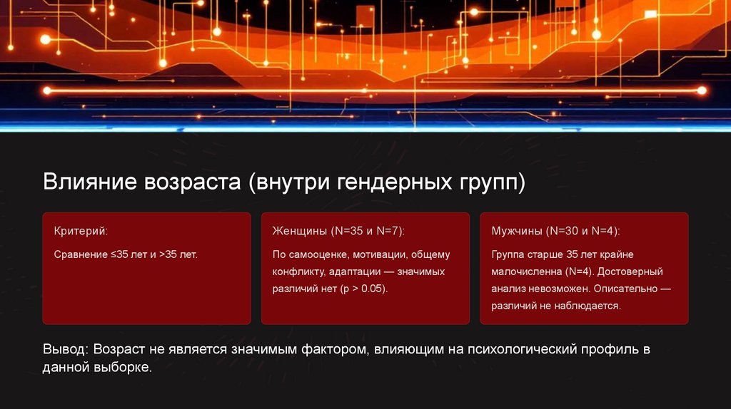 Вывод: Возраст не является значимым фактором, влияющим на психологический профиль в