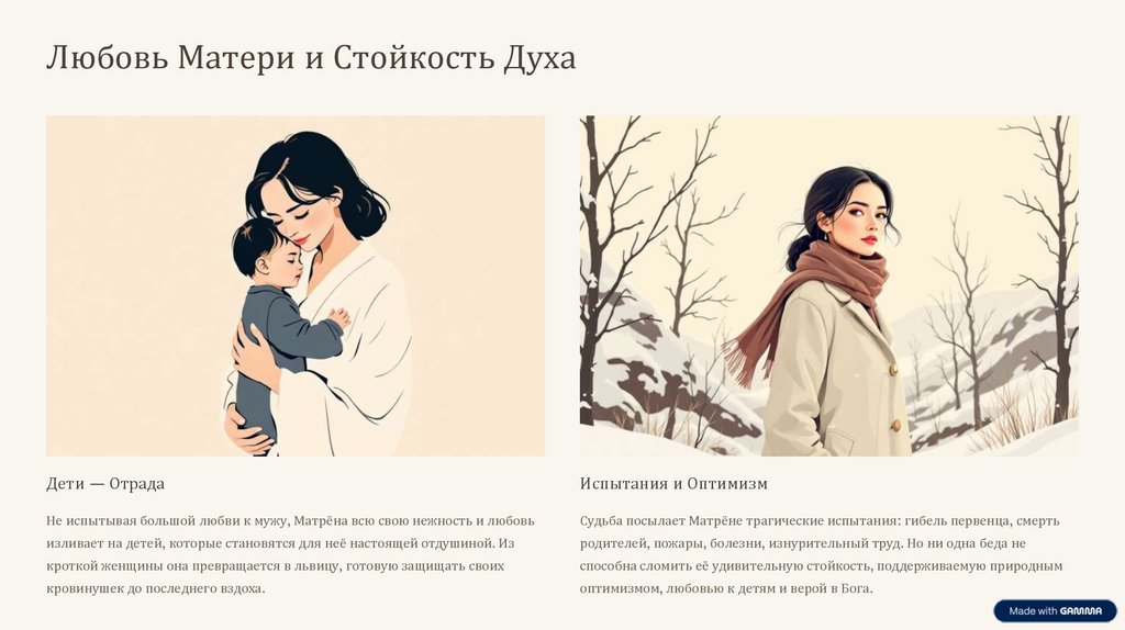 этого счастья, осознавая, сколько немыслимых страданий было пережито. Матрёна спокойно принимает свою судьбу, живя с