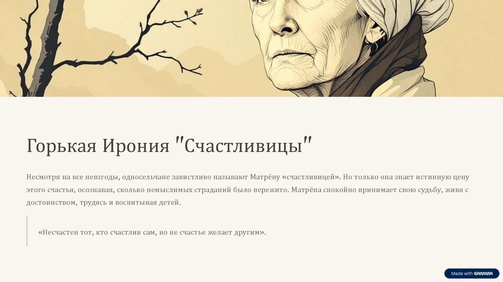Горькая Ирония "Счастливицы"Несмотря на все невзгоды, односельчане завистливо называют Матрёну «счастливицей». Но только она знает истинную цену