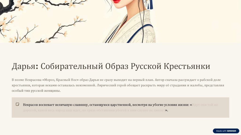 Дарья: Собирательный Образ Русской КрестьянкиВ поэме Некрасова «Мороз, Красный Нос» образ Дарьи не сразу выходит на первый план. Автор сначала рассуждает о рабской доле